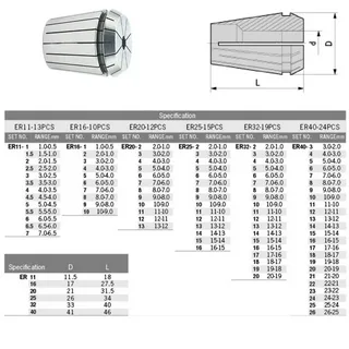 ER11 (1.2 – 3.4 – 5.6) ,ER16 (1.2 – 3.4 – 5.6 – 7.8) ,ER20 (1.2 – 3.4 – 5.6 – 7.8 – 9.10) ,ER25 (1.2 – 3.4 – 5.6 – 7.8 – 9.10) ,ER32 (1.2 – 3.4 – 5.6 – 7.8 – 9.10) |